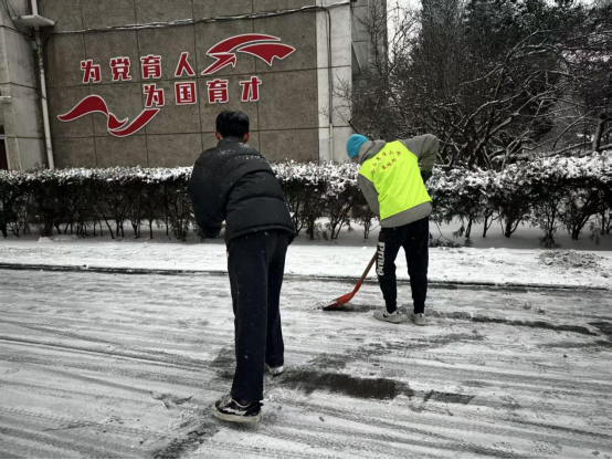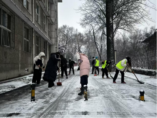 学生党员同志与学生会工作人员手持铁锹、除雪铲等工具,分工协作、默契配合仔细清扫路面积雪,以实际行动保障老师与同学们的出行安全与生活秩序。